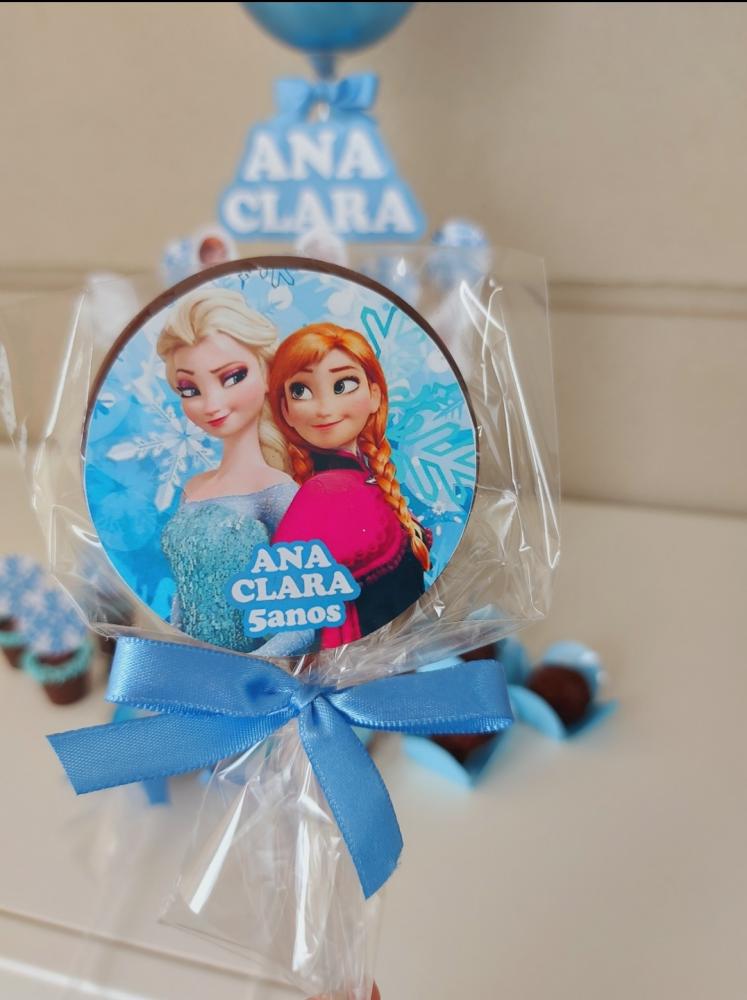 Pirulito de Chocolate decorado com adesivo do tema desejado.