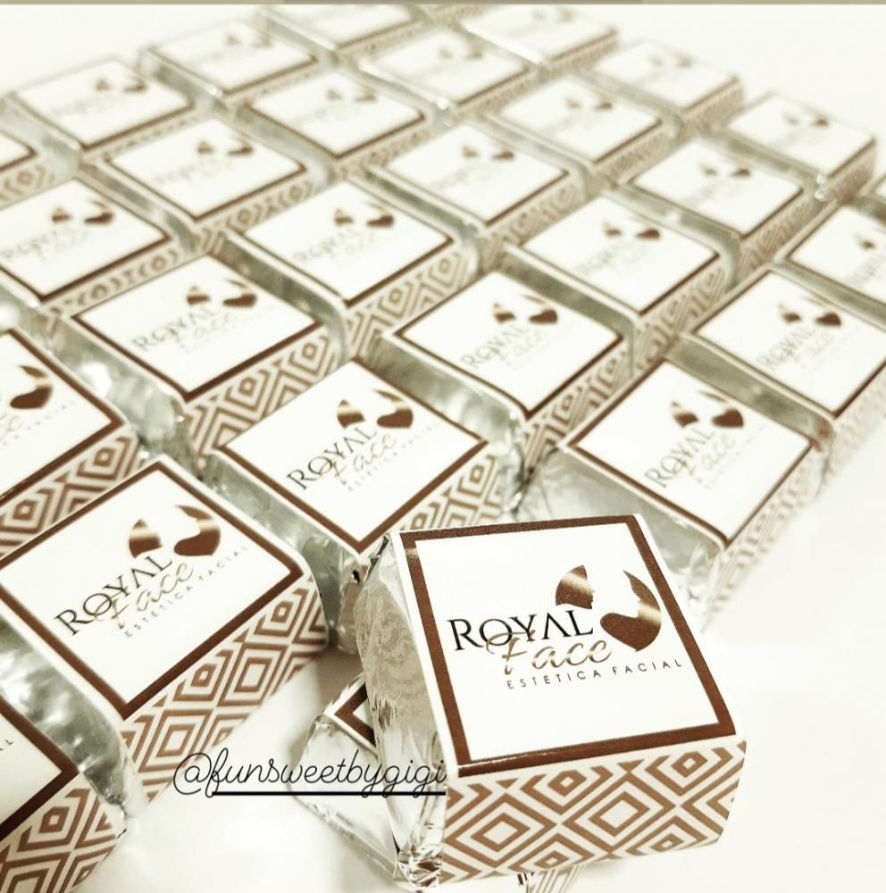 Tradicional bombom de chocolate trufado com embalagem "estilo bombom" e adesivo personalizado do tema