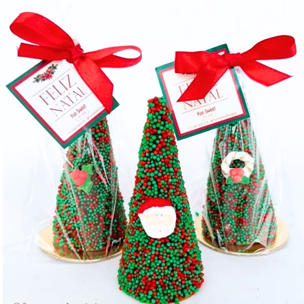 Delicioso cone trufado, casquinha crocante com recheio cremoso de chocolate, decorado como árvore de Natal.