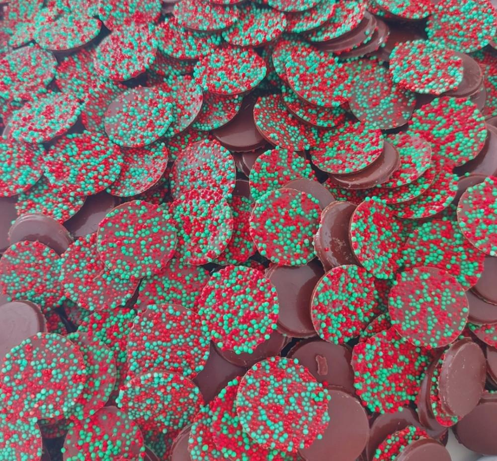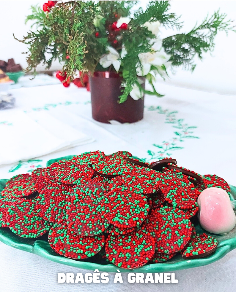 Deliciosas pastilhas de chocolate dragê, decorados com confeitos miçanga na cor do Natal.