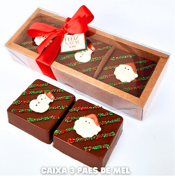 Caixa com 3 pães de mel recheados, decorados com tema Natal