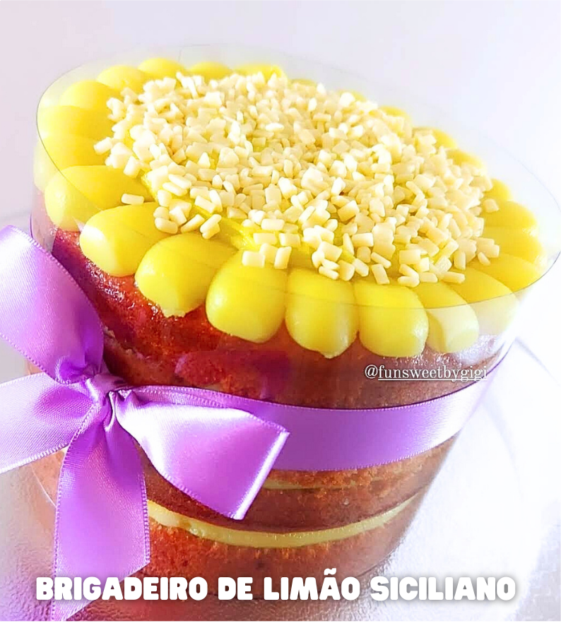 * Bolo massa branca de baunilha, recheio e cobertura de brigadeiro cremoso de limão siciliano e finalização com confeitos de granulado de chocolate branco