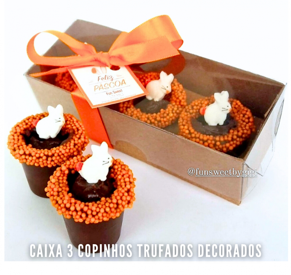 * 3 copinhos de chocolate trufados, decorados com coelhinhos em chocolate branco.