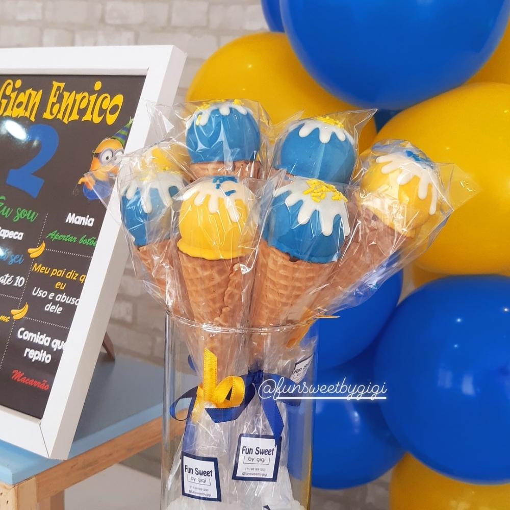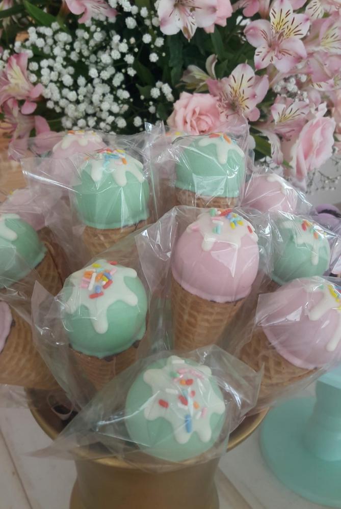 * É um cone trufado + cake pop, decorado como sorvete de casquinha nas cores desejadas.